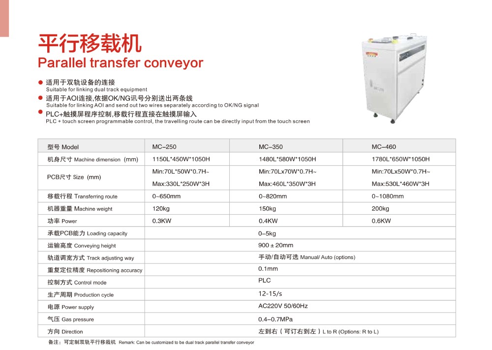 smt平行移載機(jī)介紹:適用于雙軌設(shè)備的連接;適用于AOI連接,依據(jù)OK/NG訊號(hào)分別送出兩條線;PLC+觸摸屏程序控制,移載行程直接在觸摸屏輸入。