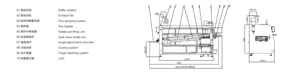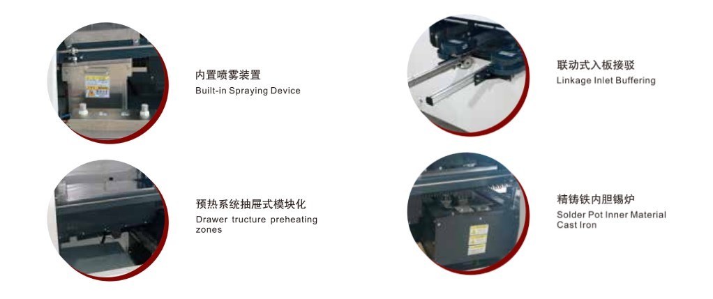 ●PC+PLC控制系統, Windows 7操作系統, 中/英文操作界面, 工藝曲線/數據自動存儲功能, 助焊劑液面過低過高報警; 錫液面過低報警;