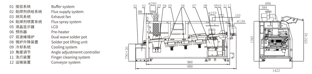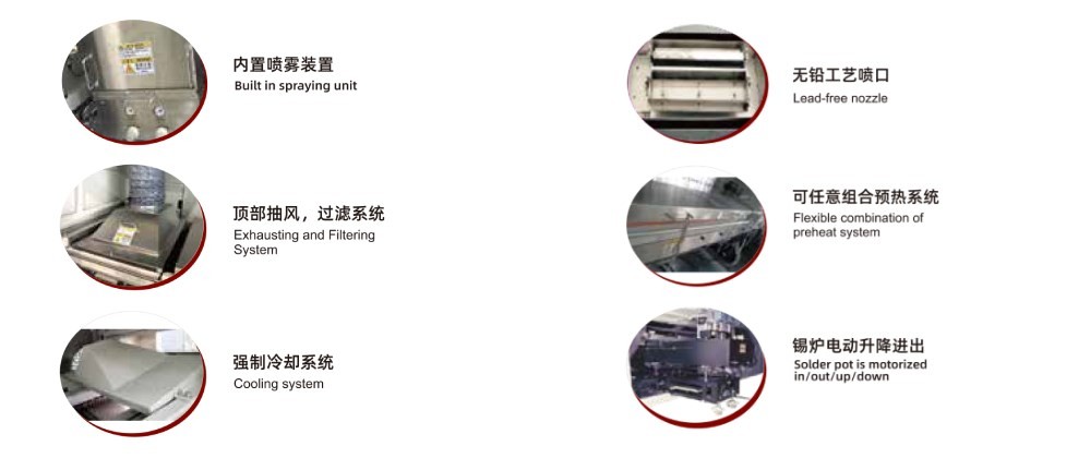 ●PC+PLC控制系統, Windows 7操作系統, 中/英文操作界面, 工藝曲線/數據自動存儲功能, 助焊劑液面過低過高報警;錫液面過低報警;